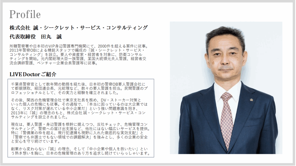 「現行犯逮捕も辞さない」要人警護・身辺警護をはじめ、危機管理コンサルティング、ストーカー対策など、お客様に「安心安全」を提供している株式会社 誠・シークレット・サービス・コンサルティング。代表取締役を務めるのは、元千葉県警察官の田丸誠社長だ。退職後は、警護・警備会社にて数々の警護現場を経験したのち、自身が考える理想の警護を実現するために独立。田丸社長の警護とは。田丸誠社長が提供する抜かりのない“安心安全”への想いを伺ってきました。