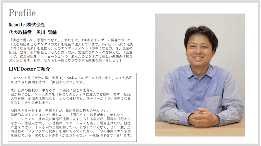 「直感で動いて、思想でつなぐ」。 スマホアプリを中心に、150本以上のカジュアルゲームを開発してきたNobollel株式会社の代表取締役・黒川晃輔社長。起業の原点にあるのは、エンタメと違和感への深い関心だった。本稿では、彼の創業ストーリーと、今後の社会を見据えたゲーミフィケーション戦略、 そして個の時代における働き方の未来についてお話を伺いました。