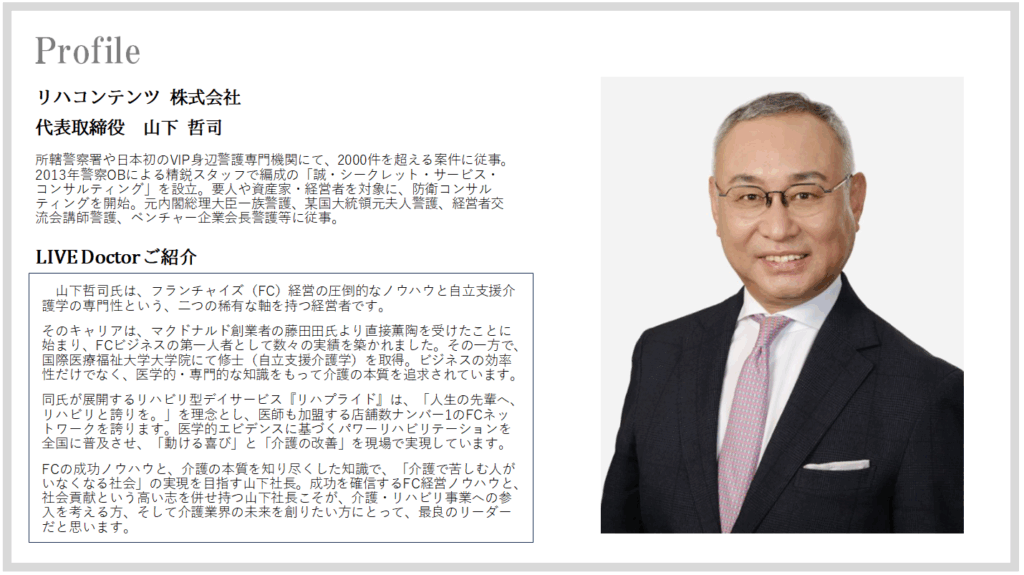 全国200店舗以上、各地でリハビリ型のデイサービスを提供する「リハプライド」。運営元であるリハコンテンツ株式会社の創業者、山下哲司社長は、デイサービスにおけるリハビリの常識を覆し、高齢者の自立と尊厳の回復を実現しています。野球少年から経営者へ、さらに介護分野の革新者となった山下社長。そのヒストリーと経営哲学、そして胸に抱く志を語ってもらいました。